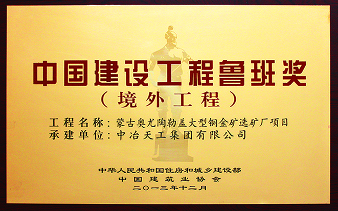 中国建设工程鲁班奖(境外工程)-蒙古奥尤陶勒盖大型铜金矿选矿厂项目工程荣获