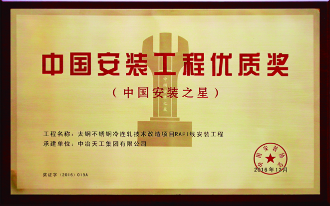 中国安装工程优质奖(中国安装之星)-太钢不锈钢冷连轧技术改造项目PAP1线安装工程