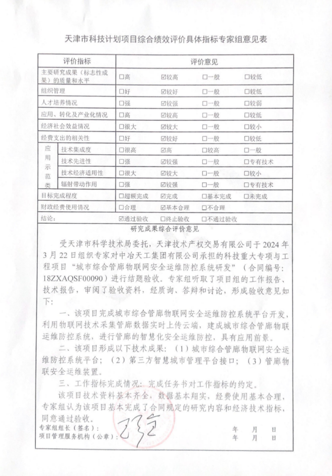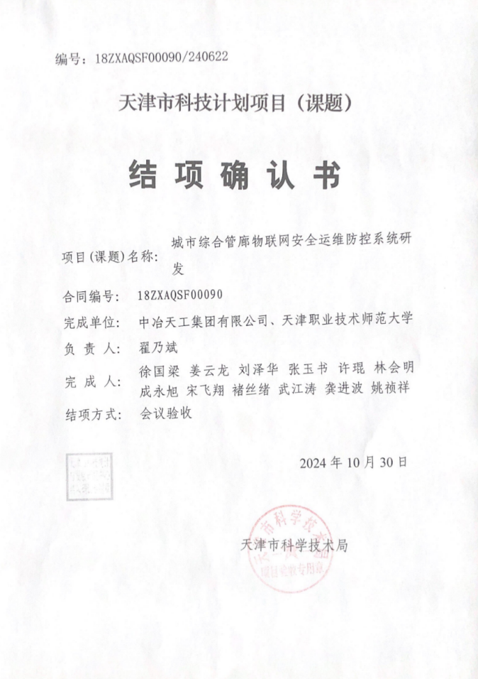 近日,由中冶天工承擔的天津市科技計劃項目《城市綜合管廊物聯(lián)網(wǎng)安全運維防控系統(tǒng)研發(fā)》通過結(jié)項驗收。該項目歷經(jīng)數(shù)年艱苦攻關(guān),系統(tǒng)地解決了基于物聯(lián)網(wǎng)技術(shù)的地下綜合管廊及管線在運行使用過程中的風險評估和安全監(jiān)管問題,并取得了一系列重要的科研成果,為推動管廊運維技術(shù)領(lǐng)域的進步和產(chǎn)業(yè)發(fā)展作出了重大貢獻。