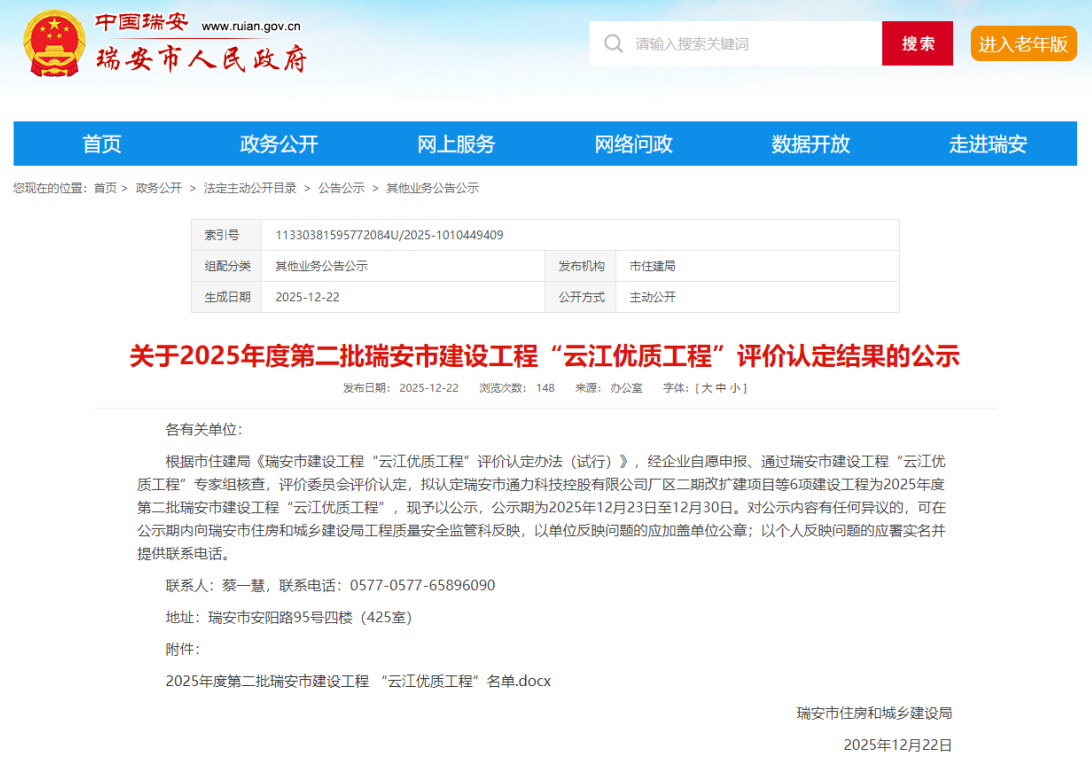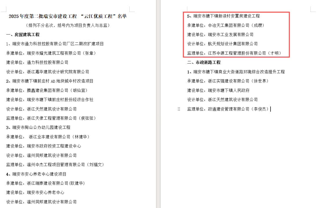 近日,南方公司瑞安塘下鎮(zhèn)104國(guó)道安置房建設(shè)項(xiàng)目新瀆村安置房建設(shè)工程榮獲2025年度第二批瑞安市建設(shè)工程“云江優(yōu)質(zhì)工程”。