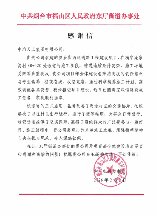 2月3日,渤海公司煙臺市福山區縣府街西延道路工程項目部收到東廳街道辦事處發來的感謝信,對項目部在縣府街西延道路工程K0+520處通道施工中展現出的卓越組織能力和攻堅精神表示高度贊揚與誠摯感謝。