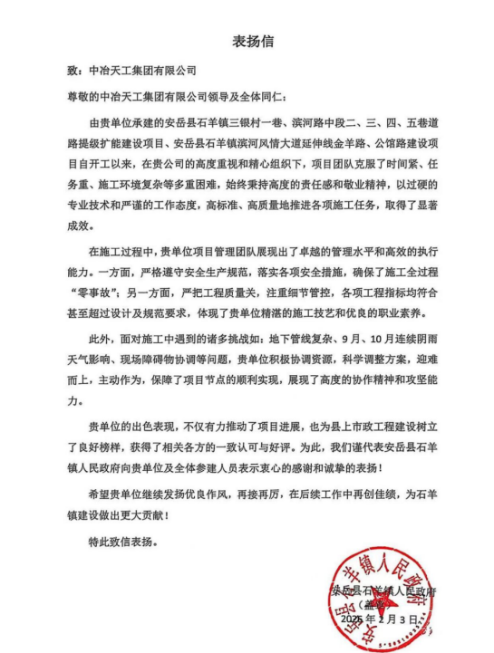 近日,城建公司四川省資陽市安岳縣石羊鎮建設項目收到安岳縣石羊鎮人民政府發來的一封感謝信。信中高度肯定了項目團隊在施工過程中精心組織、統籌規劃、攻堅克難,圓滿完成建設任務的擔當與成效,高度贊揚了中冶天工集團有限公司求真務實、銳意進取、勤于思考、敢于創新的工作作風,對項目團隊付出的努力表示敬意和感謝。