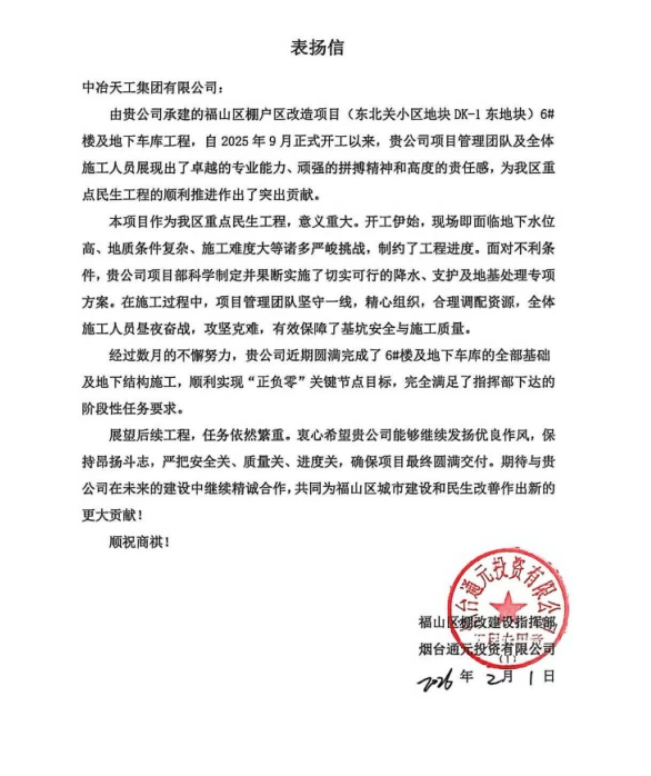 表揚信中,對項目管理團隊的專業能力、拼搏精神與責任擔當給予高度肯定,希望后續工程,能夠繼續發揚優良作風,嚴把安全、質量、進度關,確保項目最終圓滿交付,為福山區城市建設和民生改善貢獻力量。
